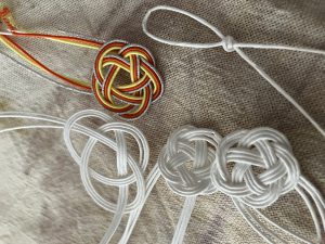 そのあとで本番の水引三本を使って梅結びまでを完成させました